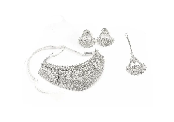 Despite its opulent look, the set is thoughtfully engineered for comfort with smooth contours, secure closures and balanced construction—so you can move, celebrate and cherish every moment without heaviness.Size & Fit: The statement choker sits gracefully along the neckline, accentuating the collarbone. The matching earrings and tikka add symmetry and polish, creating a cohesive, camera‑ready bridal silhouette.Care Instructions: To maintain the pristine finish, avoid contact with water, perfumes and chemicals. After each wear, wipe gently with a soft, dry cloth and store separately in the included Ijewelora box to preserve its radiant silver sheen.Occasion & Styling: Perfect for bridal wear, receptions, sangeet nights, festive functions and milestone celebrations. Pair with lehengas, embellished sarees or gowns for a mesmerizing finish that turns heads.Why You’ll Love It: Opulent CZ clustering, premium Silver plating and skin‑friendly comfort—crafted by Ijewelora—combine in a timeless jewellery set you’ll treasure. Shop now with Ijewelora Jewellery and enjoy luminous elegance that completes every look.