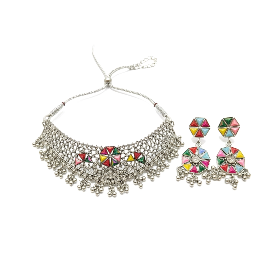 Boho Tribal Design: Net‑mesh choker with multicolour geometric motifs and ghungroo danglers; coordinated statement earrings complete a vibrant, folk‑inspired look.