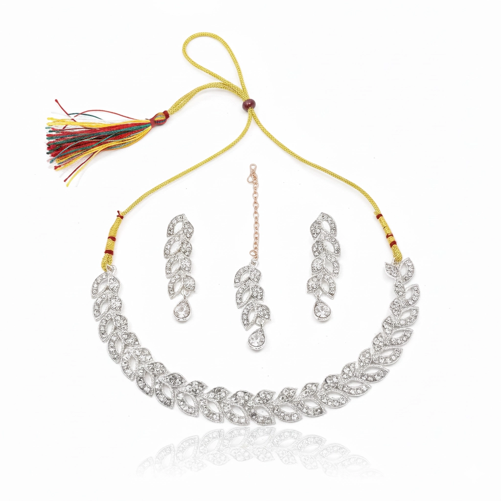 This elegant ensemble pairs a graceful choker‑style necklace with coordinated long earrings. Intricately arranged floral and marquise motifs catch the light from every angle, while premium AAA+ CZ stones deliver a brilliant, diamond‑like sparkle that looks stunning in person and in photographs.Expertly finished by Ijewelora, the jewellery features a crisp Silver plating that creates a clean, mirror‑like glow suitable for every skin tone.